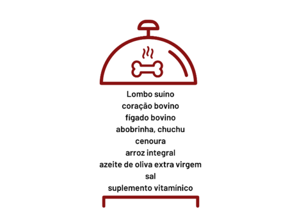 Composição básica qualitativa: Lombo suíno, coração bovino, abobrinha, chuchu, cenoura, arroz integral, fígado bovino azeite de oliva extravirgem e sal.